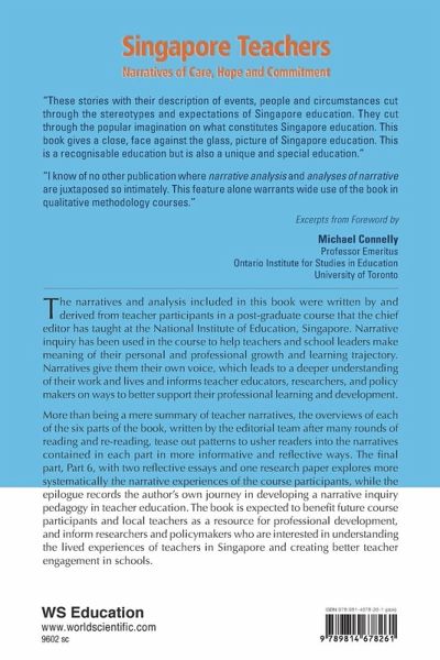 The narratives and analysis included in this book were written by and derived from teacher participants in a post-graduate course that the chief editor, Dr Fang, has taught at the National Institute of Education, Singapore. Narrative inquiry has been used in the course to help teachers and school leaders make meaning of their personal and professional growth and learning trajectory. Narratives give them their own voice, which leads to a deeper understanding of their work and lives and informs teacher educators, researchers, and policy makers on ways to better support their professional learning and development. More than being a mere summary of teacher narratives, the overviews of each of the six parts of the book, written by the editorial team after many rounds of reading and re-reading, tease out patterns to usher readers into the narratives contained in each part in more informative and reflective ways. The final part with two reflective essays and one research paper explores more systematically the narrative experiences of the course participants, while the epilogue records the author's own journey in developing a narrative inquiry pedagogy in teacher education. The book is expected to benefit future course participants and local teachers as a resource for professional development, and inform researchers and policymakers who are interested in understanding the lived experiences of teachers in Singapore and creating better teacher engagement in schools.