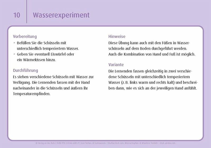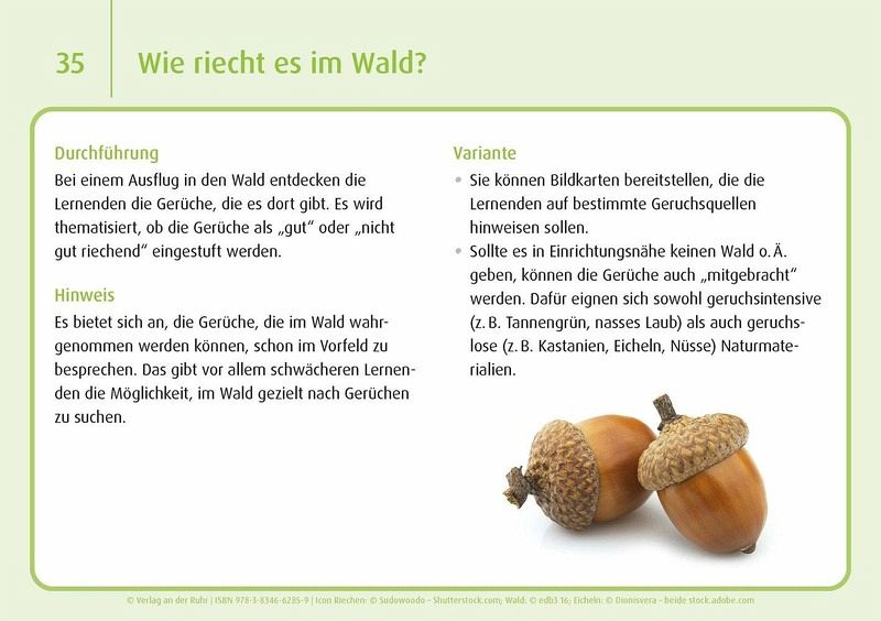 Fachunabhängiges Unterrichtsmaterial für Sonderpädagogen und Sonderpädagoginnen sowie Lehrer und Lehrerinnen an Förderschulen und inklusiven Schulen sowie für Ergotherapeuten und Ergotherapeutinnen; Klasse: 1-13 +++Sie möchten die Sinneswahrnehmung Ihrer Lernenden mit Förderbedarf im Schwerpunkt Geistige Entwicklung gezielt schärfen und ihnen ganzheitliche Lernzugänge ermöglichen?In diesem Karten-Set finden Sie unaufwändige und kurz erklärte Übungen und Spiele zur Wahrnehmungsförderung, die auf die Schärfung der 5 Sinne (Tastsinn, Sehsinn, Hörsinn, Geruchs- und Geschmackssinn) ausgerichtet sind.Neben altbekannten Übungen, bei denen Ihre Lernenden mithilfe von Fühlboxen, Klangballons oder Geruchs- und Geschmacksproben Gegenstände, Klänge, Gerüche oder Lebensmittel identifizieren sollen, enthält die Kartei auch zahlreiche innovative Vorschläge, um mit ganzheitlichem Lernen spielerisch die Körperwahrnehmung zu verbessern.Ob in der Sonderpädagogik, der Ergo- und Sprachtherapie oder im inklusiven Unterricht - Sie können die Ideen vielfältig zur Förderung von Wahrnehmung und Motorik einsetzen und zugleich zur Steigerung der Konzentrationsfähigkeit Ihrer Lernenden beitragen.
