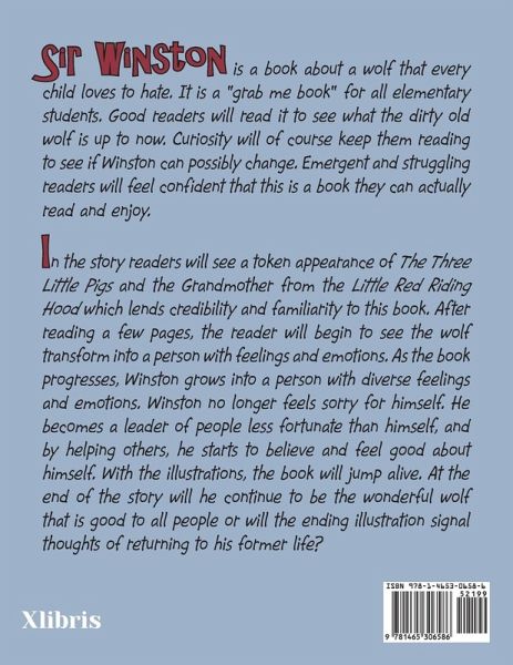 Sir Winston is a book about a wolf that every child loves to hate. It is a "grab me book" for all elementary students. Good readers will read it to see what the dirty old wolf is up to now. Curiosity will of course keep them reading to see if Winston can possibly change. Emergent and struggling readers will feel confident that this is a book they can actually read and enjoy. In the story readers will see a token appearance of The Three Little Pigs and the Grandmother from the Little Red Riding Hood which lends credibility and familiarity to this book. After reading a few pages, the reader will begin to see the wolf transform into a person with feelings and emotions. As the book progresses, Winston grows into a person with diverse feelings and emotions. Winston no longer feels sorry for himself. He becomes a leader of people less fortunate than himself, and by helping others, he starts to believe and feel good about himself. With the illustrations, the book will jump alive. At the end of the story will he continue to be the wonderful wolf that is good to all people or will the ending illustration signal thoughts of returning to his former life?