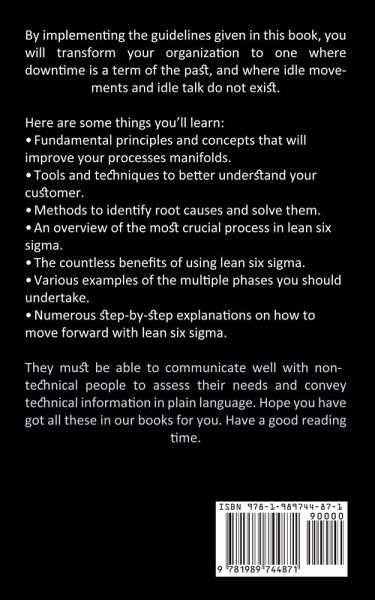 By implementing the guidelines given in this book, you will transform your organization to one where downtime is a term of the past, and where idle movements and idle talk do not exist. Here are some things you'll learn: ¿ Fundamental principles and concepts that will improve your processes manifolds. ¿ Tools and techniques to better understand your customer. ¿ Methods to identify root causes and solve them. ¿ An overview of the most crucial process in lean six sigma. ¿ The countless benefits of using lean six sigma. ¿ Various examples of the multiple phases you should undertake. ¿ Numerous step-by-step explanations on how to move forward with lean six sigma. They must be able to communicate well with non-technical people to assess their needs and convey technical information in plain language. Hope you have got all these in our books for you. Have a good reading time.