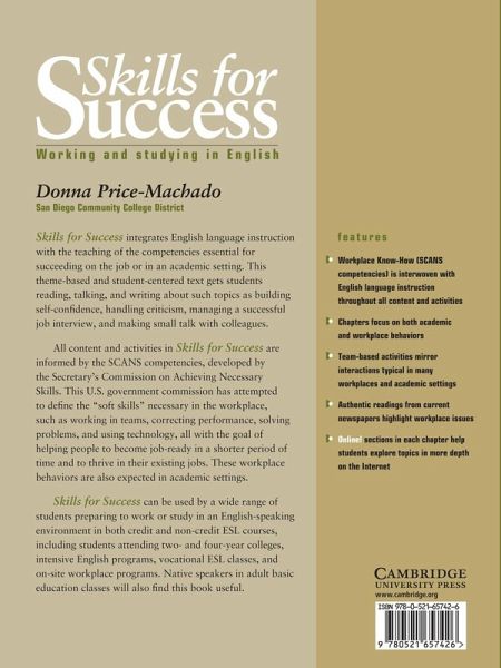 Skills for Success focuses on workplace know-how (SCANS) and prepares students for higher learning. Skills for Success is the first content-based skills text to integrate English-language instruction with the teaching of skills essential to vocational or college-based students. Theme-based and interactive, Skills for Success emphasizes development of all four language skills through cooperative learning techniques.