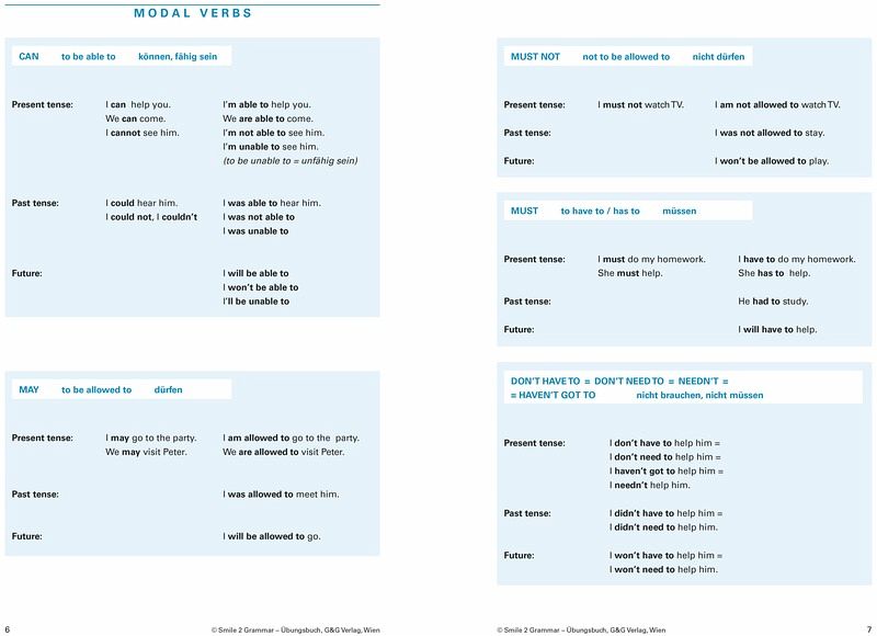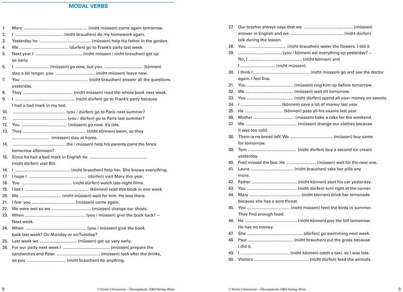 Der zweite Band der erfolgreichen SMILE-Übungsreihe behandelt wichtige Grammatikkapitel aus dem zweiten Lernjahr. Durch die, den vielen Übungssätzen vorangestellten Grammatikregeln und dem "Key" im Anhang ist das Buch sowohl zum Selbststudium als auch als Hilfsmittel für den Unterricht geeignet. Im "Key" finden sich gelegentlich Hinweise auf Smile 1 (mit Angabe der Seite) bzw auf die im jeweiligen Fall zutreffende Grammatikregel. Sind bei den Übungssätzen mehrere Lösungen möglich, so sind auch diese im Key zu finden. Neue Vokabel sind mit der im Buch geltenden deutschen Bedeutung vor dem Key zusammengestellt.