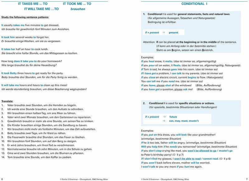 Auch im dritten Band der bekannten SMILE-Reihe findet die Schülerin/der Schüler wichtige Grammatikregeln übersichtlich zusammengestellt, gefolgt von zahlreichen Übungsbeispielen. Wie schon aus den vorigen Bänden gewohnt, finden sich Vokabelerklärungen und der Key am Ende des Buches. Regeln aus vorangegangenen Schuljahren werden durch kleine HInweise auf Smile 1 und Smile 2 nicht in Vergesseheit geraten!