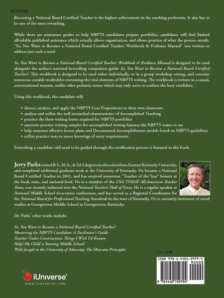 Becoming a National Board Certified Teacher is the highest achievement in the teaching profession. It also has to be one of the most rewarding. While there are numerous guides to help NBPTS candidates prepare portfolios, candidates will find limited affordable published assistance which actually allows organization, and allows practice of what the process entails. "So, You Want to Become a National Board Certified Teacher: Wrokbook & Evidence Manual" was written to address just such a need. "So, You Want to Become a National Board Certified Teacher: Workbook & Evidence Manual" is designed to be used alongside the author's national bestselling companion guide: "So, You Want to Become a National Board Certified Teacher?". This workbook is designed to be used either individually, or in a group workshop setting, and contains numerous useable worktables containing the vital elements of NBPTS writing. The workbook is written in a casual, conversational manner, unlike other pedantic tomes which may only serve to confuse the busy candidate. Using this workbook, the candidate will: dissect, analyze, and apply the NBPTS Core Propositions to their own classroom analyze and utilize the well-researched characteristics of Accomplished Teaching practice the three writing forms required for NBPTS portfolios annotate practice writing samples for accomplished writing features the NBPTS wants to see help structure effective lesson plans and Documented Accomplishment models based on NBPTS guidelines utilize practice tests to assess knowlege of entry requirements Everything a candidate will need to be guided through the certification process is featured in this book.
