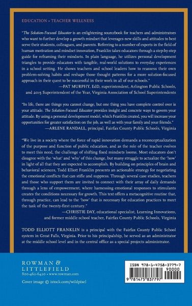 Foreword Todd Whitaker Preface Acknowledgments Section I: Understanding Your Current Mindset Before Generating Solutions The Me-Self Assessment Chapter 1: School Mindset: The Brain and The Triangle Chapter 2: Professional Happiness-Anticipation is the Key Chapter 3:Emotional Pressurization and Your School Mindset Chapter 4: Adopting a Different View for School Before September Chapter 5: Achieving that Balance in Schools--Listen to Your Self-Talk Section II. Action Steps for Tackling the Compressed Mindset Chapter 6: Reset Your Bar of Contentment at the Beginning of School Chapter 7: Winning with Whys: Getting to tnhe Root of Your School Stress Chapter 8: Focusing vs. Fixating in Schools Chapter 9: Remove Your School Sandbags and Become Your Own Innovator Section III: Real World Application for the Solution Focused Educator Chapter 10: Meetings at School Chapter 11: Grading and Reporting Chapter 12: School Climate and Personalized Professional Development Chapter 13: Strategies for Conflict Resolution Teacher-Teacher-Principal Section IV: Personal Growth for The Solution Focused Educator Chapter 14: Social Networking, Learned Shifting: Millennials and Beyond Chapter 15: Is Teaching the Profession for You? Chapter 16: Resiliency: Don't Let You Beat You and the Roles We Play at School Chapter 17: Backwards Design and Winning Differently Appendix A: Playbook of Professional Development Exercises for School Staff Bibliography About the Author