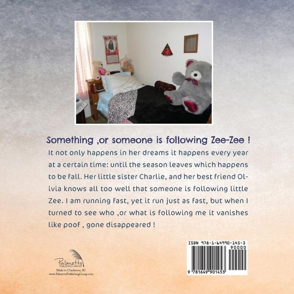 Something, or someone is following Zee-Zee! It not only happens in her dreams it happens every year at a certain time, the season leaves, which happens to be fall. Her little sister Charlie, and her best friend Olivia know all too well that someone is following little Zee. I am running fast, yet it runs just as fast, but when I turned to see who, or what is following me, it vanishes like poof...gone...disappeared!