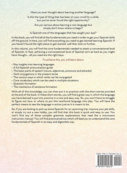 Have you ever thought about learning another language? Is this the type of thing that has been on your mind for a while, but you've never found the right opportunity? Are you serious about learning a new language but don't know where to begin? Is Spanish one of the languages that has caught your eye? In this book, you will find all of the fundamentals you need to get your Spanish skills off the ground. In here, you will find everything you need to get started learning Spanish. If you haven't found the right place to get started, well, then look no further. In this volume, you will find the core fundamentals needed to attain a conversational level of Spanish. I n fact, achieving a conversational level of Spanish isn't as hard as you might have thought... all you need are the right keys. To achieve this, you will learn about: ¿Key insights into learning languages ¿A full Spanish pronunciation guide ¿The basic parts of speech (nouns, adjectives, pronouns and adverbs) ¿Verb conjugations in the present tense ¿The various ways in which verbs can be conjugated ¿Core vocabulary which can be used in multiple situations ¿Question formation ¿The mechanics of sentence formation With all of this knowledge, you can then put it to practice with the short stories provided at the end of the book. In these short stories, you will find a great way in which the language you have learned is put into practice in a nice and easy way. So, you won't have to struggle to figure out how or where to put this newfound language into play. You will have the perfect means to see the language in action just as it is meant to be. So, what are you waiting for? ¿Scroll up to the top and click the ADD TO CART button and get started learning Spanish today!