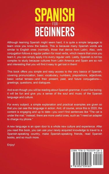 If you want to learn the Spanish language without any previous knowledge, then keep reading... Wanting to learn the Spanish language, but don't know how - or where - to start? If so, you've come to the right place. The purpose of this book is to show you that you can learn a language, no matter how hard it might seem in the beginning. This book will show you that learning Spanish is quite simple once you know the basics. You will find that many Spanish words are similar to English ones. Also, you will learn that verb conjugation follows a regular pattern for most verbs, which means that once you learn it, you can simply apply it to every regular verb. For every subject in the book, a simple explanation and practical examples are given so that you can see the language in action. Here's just a fraction of what you'll learn:The basics, such as the Spanish alphabet, numbers, and days of the week. Many useful nouns and verbs, and examples of how they are used in sentences. The grammar rules that apply. Basic Spanish phrases to be used in conversations. Useful phrases when traveling, at the hotel, in restaurants, or shops. Many, many different words for daily use. And much more! A new language is an open door to a whole new culture and experience. After you read this book, you can use your newly acquired knowledge to travel to a Spanish-speaking country, make Spanish-speaking friends, read Spanish books, and so much more So, what are you waiting for? Grab this book now, and start learning Spanish today!