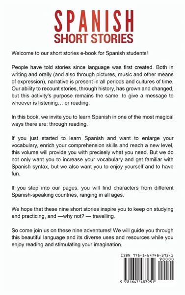 If you're looking for a fun, quick and excellent way to learn Spanish then keep reading... Do you want to boost your comprehension and grow your vocabulary while enjoying yourself? These captivating stories will ignite your imagination so you can learn Spanish quickly and easily. Say goodbye to scratching your head in confusion Forget about reading boring Spanish textbooks that are so long you'll never reach the end. With Spanish Short Stories: 9 Simple and Captivating Stories for Effective Spanish Learning for Beginners, you will experience a relief from the frustrations you might have experienced when trying to learn Spanish through a more rigid approach. In this book, you will encounter rich and new but not too complex vocabulary, which is translated at the end of the chapter, avoiding the hassle of having to stop the reading rhythm to look up every word in the dictionary. Every paragraph is translated, as well as the summary of the story, thus providing a clearer comprehension of each sentence, while trying to prevent the temptation that the reader might have, if discouraged, of giving up and reading the whole story in English. After each chapter, there is a question section, which aims to test the reader’s overall understanding of the story, containing both open-ended and multiple-choice questions. The solved questions are provided at the end, enabling you to check your own answers and, consequently, develop your skills. So if you want to learn Spanish in a fun way and also in less time, click "add to cart"!