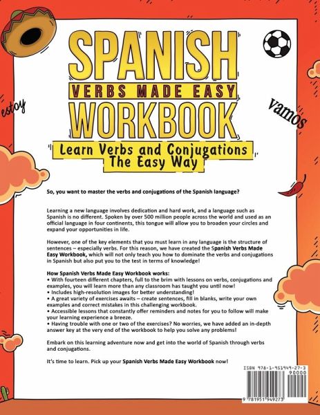 So, you want to master the verbs and conjugations of the Spanish language? Learning a new language involves dedication and hard work, and a language such as Spanish is no different. Spoken by over 500 million people across the world and used as an official language in four continents, this tongue will allow you to broaden your circles and expand your opportunities in life. However, one of the key elements that you must learn in any language is the structure of sentences - especially verbs. For this reason, we have created the Spanish Verbs Made Easy Workbook, which will not only teach you how to dominate the verbs and conjugations in Spanish but also put you to the test in terms of knowledge! How Spanish Verbs Made Easy Workbook works: · With fourteen different chapters, full to the brim with lessons on verbs, conjugations and examples, you will learn more than any classroom has taught you until now! · Includes high-resolution images for better understanding! · A great variety of exercises awaits - create sentences, fill in blanks, write your own examples and correct mistakes in this challenging workbook. · Accessible lessons that constantly offer reminders and notes for you to follow will make your learning experience a breeze. · Having trouble with one or two of the exercises? No worries, we have added an in-depth answer key at the very end of the workbook to help you solve any problems! Embark on this learning adventure now and get into the world of Spanish through verbs and conjugations. It's time to learn. Pick up your Spanish Verbs Made Easy Workbook now!