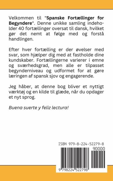Velkommen til bogen "Spanske Fortællinger for Begyndere". Denne unikke samling indeholder 40 fortællinger, som er nøje udvalgt for at hjælpe dig med at lære spansk. Hver fortælling er oversat til dansk, hvilket gør det nemmere at forstå og følge med i historien. Desuden finder du efter hver fortælling øvelser med svar, der hjælper dig med at fastholde den viden, du har opnået. Fortællingerne i denne bog varierer i emner og sværhedsgrad, men alle er tilpasset begynder-niveau. Du finder her hverdagsfortællinger samt mere spændende eventyr. Hver fortælling har til formål at udvikle din forståelse af det spanske sprog på en behagelig og engagerende måde. Øvelserne, der følger med hver fortælling, er designet til at teste din tekstforståelse og hjælpe dig med at lære nye ord og grammatiske strukturer. Takket være dem kan du systematisk udvikle dine sprogfærdigheder. Jeg håber, at denne bog vil blive ikke kun et værktøj til at lære sproget, men også en kilde til glæde og tilfredshed ved at opdage et nyt sprog. Buena suerte y feliz lectura!
