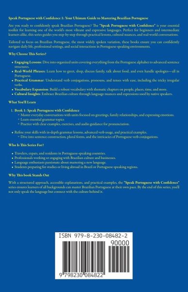 Speak Portuguese with Confidence 1: Your Ultimate Guide to Mastering Brazilian Portuguese Are you ready to confidently speak Brazilian Portuguese? The "Speak Portuguese with Confidence" is your essential toolkit for learning one of the world's most vibrant and expressive languages. Perfect for beginners and intermediate learners alike, this series guides you step-by-step through practical lessons, cultural nuances, and real-world conversations. Tailored to focus on Brazilian Portuguese, the most widely spoken variation, these books ensure you can confidently navigate daily life, professional settings, and social interactions in Portuguese-speaking environments. Why Choose This Series?Engaging Lessons: Dive into organized units covering everything from the Portuguese alphabet to advanced sentence structures. Real-World Phrases: Learn how to greet, shop, discuss family, talk about food, and even handle apologies-all in Portuguese. Practical Grammar: Understand verb conjugations, pronouns, and tenses with ease, including the tricky irregular verbs. Vocabulary Expansion: Build a robust vocabulary with thematic chapters on people, places, time, and more. Cultural Insights: Embrace Brazilian culture through language nuances and expressions used by native speakers. What You'll LearnBook 1: Speak Portuguese with ConfidenceMaster everyday conversations with units focused on greetings, family relationships, and expressing emotions. Learn essential grammar topics Practice with clear examples, exercises, and audio guidance for pronunciation. Refine your skills with in-depth grammar lessons, advanced verb usage, and practical examples.Dive into sentence construction, plural forms, and the intricacies of Portuguese verb conjugations. Who Is This Series For?Travelers, expats, and residents in Portuguese-speaking countries. Professionals working or engaging with Brazilian culture and businesses. Language enthusiasts passionate about mastering a new language. Students preparing for studies or living abroad in Brazil or Portuguese-speaking regions. Why This book Stands Out With a structured approach, accessible explanations, and practical examples, the "Speak Portuguese with Confidence" series ensures learners of all backgrounds can master Brazilian Portuguese at their own pace. By the end of this series, you'll not only speak the language but connect with the culture behind it.