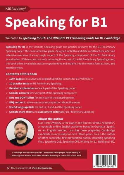 SPEAKING B1: THE ULTIMATE PET SPEAKING GUIDE FOR B1 CAMBRIDGE & 10 PRACTICE TESTS FOR B1 PRELIMINARY SPEAKING Unlock the secrets of the B1 Preliminary Speaking test with this comprehensive guide specifically tailored for those preparing for the B1 Preliminary test by Cambridge Assessment English. This invaluable resource is not just for students but also an essential tool for teachers guiding their students through the Speaking paper of the B1 Preliminary, formerly known as the Preliminary English Test (PET). WHAT'S INSIDE THIS SPEAKING B1 GUIDE? - 100+ pages of exclusive and original Speaking content for B1 Preliminary. - 10 practice tests that mirror the format and content of the B1 Preliminary Speaking exam. - Detailed explanations of each part of the Speaking paper. - Sample answers for every part of the Speaking component. - DOs and DONT's lists for each part of the Speaking exam. - FAQ section to solve every common question about the exam. - Useful language lists for parts 2, 3 and 4 of the Speaking paper. - Sample mark sheet and assessment criteria for B1 Preliminary Speaking. SPEAKING B1 GUIDE FOR TEACHERS AND STUDENTS This guide is perfect for: - Aspiring B1-level English language speakers aiming for success in the B1 Preliminary certificate. - EFL teachers seeking quality exam prep material for their students taking the B1 Preliminary exam soon. B1 PRELIMINARY SPEAKING TEST The B1 Preliminary Speaking test is designed to assess the oral proficiency of candidates at a B1 level (intermediate). It comprises four distinct parts, each testing different aspects of spoken English in various contexts: B1 Speaking Part 1 This introductory part involves a conversation between the examiner and the candidate. Candidates are asked personal questions about familiar topics like their hobbies, daily routines, and interests. B1 Speaking Part 2 In this part, candidates are given a colour photograph and asked to describe it. They need to speak for about a minute, focusing on describing what they see in the picture, thus testing their ability to articulate observations and details in English. B1 Speaking Part 3 In this part, candidates are presented with a situation and some visual prompts, and they need to discuss the options and come to a decision together. It tests candidates' ability to engage in a discussion, express opinions, agree or disagree, and negotiate. B1 Speaking Part 4 The final part extends the discussion from Part 3. The examiner asks candidates questions related to the topic discussed in Part 3. This part evaluates the candidates' ability to express and justify opinions, agree or disagree with their partner, and engage in a more in-depth discussion on the topic. TAKE CONTROL OF YOUR SPEAKING SKILLS Thanks to this book, you can embrace a systematic approach to mastering the B1 Preliminary Speaking test. Through repeated practice and exposure to our expertly crafted materials, you or your students will gain confidence and a clear understanding of what to expect on the day of the exam. ABOUT THE AUTHOR Luis Porras Wadley is the owner and director of KSE Academy, an online English academy and former official Cambridge Exam Preparation Centre. As an English teacher, Luis has been preparing Cambridge candidates successfully for over fifteen years. He is the author of other successful test preparation books, including Use of English B2, Use of English C1, Writing B1, Writing B2, Writing C1 and Writing C2.