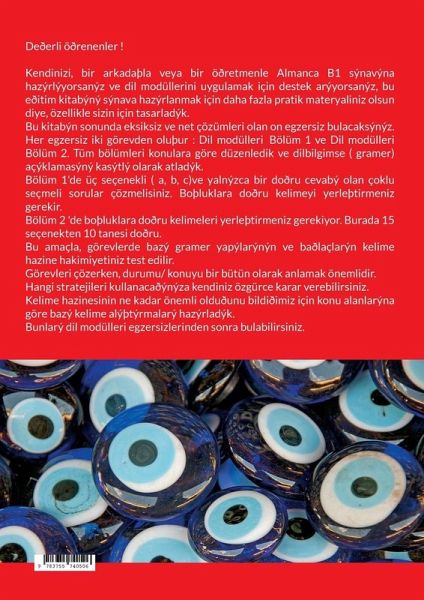 Dieses Buch ist für Sie das Richtige, wenn Sie- Türkisch als Muttersprache sprechen,- sich auf die Prüfung Deutsch B1 vorbereiten,- mehr Sprachbausteine üben möchten.In diesem Buch finden Sie 10 Modelltests mit Sprachbausteinen Teil 1 und Teil 2 ( 10 Dil Modülleri: Bölüm 1 + Bölüm 2) wie in der Prüfung Deutsch B1 (Almanca B1).Alle Aufgaben und Texte sind ins Türkische übersetzt. Am Ende des Buchs finden Sie die Lösungen.Außerdem gibt es im Buch zahlreiche Übungen zum Wortschatz und Tipps mit Übersetzungen ins Türkische.Viel Spaß beim Üben und viel Erfolg in der Prüfung!