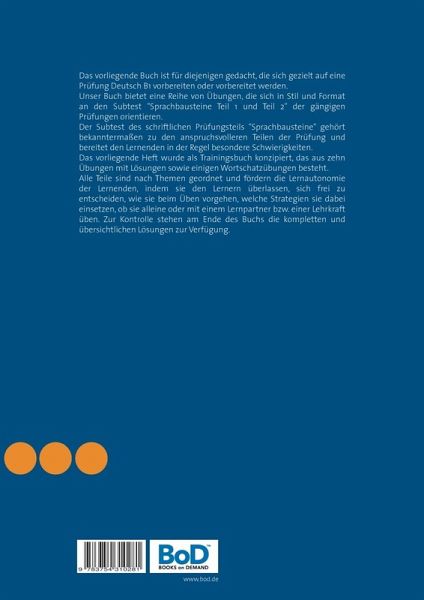 Liebe Lernende!Sie bereiten sich selbstständig, mit einem Lernpartner oder mit einem Lehrer auf die Prüfung Deutsch B1 vor und suchen nach einer Unterstützung bei der Übung von Sprachbausteinen.Speziell für Sie haben wir dieses Trainingsbuch entwickelt, damit Sie mehr Übungsmaterial zur Prüfungsvorbereitung haben. In dem vorliegenden Buch finden Sie zehn Übungen mit den kompletten und übersichtlichen Lösungen am Ende des Buchs. Jede Übung besteht aus zwei Aufgaben: Sprachbausteine Teil 1 und Sprachbausteine Teil 2. Wir haben alle Teile nach Themen geordnet und absichtlich auf die grammatikalische Erklärung verzichtet. In den Aufgaben wird die Beherrschung vom Wortschatz, einigen grammatischen Strukturen sowie Konnektoren getestet. Beim Lösen der Aufgaben ist es wichtig, die Situation als Ganzes zu verstehen. Es ist Ihnen überlassen, sich frei zu entscheiden, welche Strategien Sie dabei einsetzen.Da wir wissen, wie wichtig der Wortschatz ist, haben wir zusätzlich einige Wortschatzübungen nach Themenfeldern ausgearbeitet. Sie finden sie im Anschluss an die Übungen mit den Sprachbausteinen.