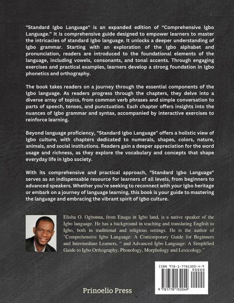 "Standard Igbo Language" is an expanded edition of "Comprehensive Igbo Language." It is comprehensive guide designed to empower learners to master the intricacies of standard Igbo language. It unlocks a deeper understanding of Igbo grammar. Starting with an exploration of the Igbo alphabet and pronunciation, readers are introduced to the foundational elements of the language, including vowels, consonants, and tonal accents. Through engaging exercises and practical examples, learners develop a strong foundation in Igbo phonetics and orthography. The book takes readers on a journey through the essential components of the Igbo language. As readers progress through the chapters, they delve into a diverse array of topics, from common verb phrases and simple conversation to parts of speech, tenses, and punctuation. Each chapter offers insights into the nuances of Igbo grammar and syntax, accompanied by interactive exercises to reinforce learning. Beyond language proficiency, "Standard Igbo Language" offers a holistic view of Igbo culture, with chapters dedicated to numerals, shapes, colors, nature, animals, and social institutions. Readers gain a deeper appreciation for the word usage and richness, as they explore the vocabulary and concepts that shape everyday life in Igbo society. With its comprehensive and practical approach, "Standard Igbo Language" serves as an indispensable resource for learners of all levels, from beginners to advanced speakers. Whether you're seeking to reconnect with your Igbo heritage or embark on a journey of language learning, this book is your guide to mastering the language and embracing the vibrant spirit of Igbo culture.