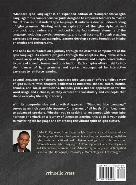 "Standard Igbo Language" is an expanded edition of "Comprehensive Igbo Language." It is comprehensive guide designed to empower learners to master the intricacies of standard Igbo language. It unlocks a deeper understanding of Igbo grammar. Starting with an exploration of the Igbo alphabet and pronunciation, readers are introduced to the foundational elements of the language, including vowels, consonants, and tonal accents. Through engaging exercises and practical examples, learners develop a strong foundation in Igbo phonetics and orthography. The book takes readers on a journey through the essential components of the Igbo language. As readers progress through the chapters, they delve into a diverse array of topics, from common verb phrases and simple conversation to parts of speech, tenses, and punctuation. Each chapter offers insights into the nuances of Igbo grammar and syntax, accompanied by interactive exercises to reinforce learning. Beyond language proficiency, "Standard Igbo Language" offers a holistic view of Igbo culture, with chapters dedicated to numerals, shapes, colors, nature, animals, and social institutions. Readers gain a deeper appreciation for the word usage and richness, as they explore the vocabulary and concepts that shape everyday life in Igbo society. With its comprehensive and practical approach, "Standard Igbo Language" serves as an indispensable resource for learners of all levels, from beginners to advanced speakers. Whether you're seeking to reconnect with your Igbo heritage or embark on a journey of language learning, this book is your guide to mastering the language and embracing the vibrant spirit of Igbo culture.