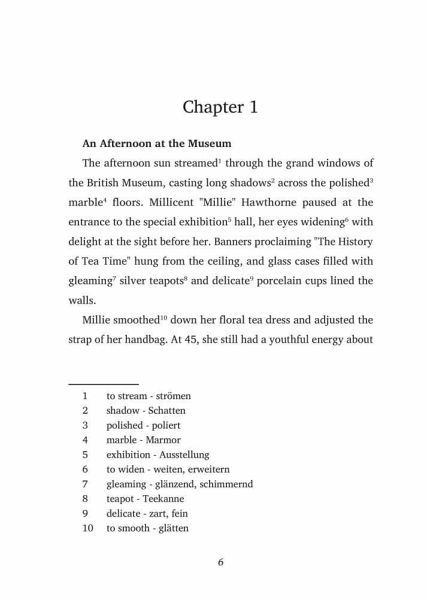 Steep in Time - Steil in die ZeitEin mitreißender Krimi für TeeliebhaberLondon, die Stadt der Geheimnisse und des Tees. Als eine wertvolle antike Teeuhr aus dem Britischen Museum gestohlen wird, ahnt die Teehausbesitzerin Millie Hawthorne nicht, dass sie bald in einen Strudel aus Intrigen und Gefahr geraten wird.Zusammen mit dem jungen, ehrgeizigen Polizisten Rupert Blackwood folgt Millie einer Spur von kryptischen Hinweisen durch die verwinkelten Gassen Londons. Doch je tiefer sie in den Fall eintauchen, desto klarer wird: Hier geht es um weit mehr als nur eine gestohlene Uhr.Ein mysteriöser Mann mit Gehstock, eine nervöse Kuratorin und geheime Botschaften in Teeblättern - können Millie und Rupert das Rätsel lösen, bevor die Zeit abläuft?Tauchen Sie ein in eine Welt voller dampfender Teetassen, tickender Uhren und tödlicher Geheimnisse. " Steep in Time" ist der perfekte Schmöker für alle Fans von cozy crimes und britischem Flair. Tauchen Sie ein in die erste packende Geschichte der "Tea Time Terrors" Serie und lassen Sie sich von der Brandung der Spannung mitreißen!Tauchen Sie ein in eine Serie packender Krimis, die Ihr Herz schneller schlagen lassen und Ihr Englisch auf das nächste Level bringen. Diese Geschichten sind keine trockenen Lerntexte, sondern nervenaufreibende Pageturner, die Sie mitten in die Action katapultieren. Speziell für Englischlernende auf B1-B2-Niveau entwickelt, bietet jedes Kapitel nicht nur ein spannendes Abenteuer, sondern auch ein umfassendes Glossar. Unbekannte Begriffe? Kein Problem! Am Ende jedes Kapitels finden Sie Übersetzungen, die Ihnen helfen, ohne den Lesefluss zu stören. So können Sie sich voll und ganz in die Handlung vertiefen und gleichzeitig Ihre Sprachkenntnisse verfeinern. Ideal für alle, die Krimis lieben und dabei ganz nebenbei ihr Englisch verbessern möchten.