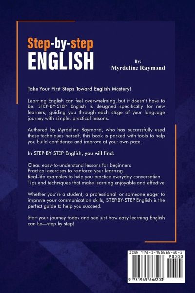 STEP-BY-STEP English: A Beginner's Guide to Learning English (with Haitian Creole Translations) Are you eager to learn English but find yourself struggling with confusing lessons and difficult vocabulary? Have you ever wished for a guide that understands your unique challenges as a Haitian Creole speaker? Look no further-STEP-BY-STEP English is here to make your language-learning journey easier, more effective, and tailored specifically to your needs. STEP-BY-STEP English is a carefully crafted resource designed by Myrdeline Raymond, an experienced English teacher who has lived the experience of learning a second language herself. Having grown up speaking Haitian Creole and mastering English later in life, she understands the obstacles faced by new learners, particularly those coming from non-English-speaking backgrounds. This guide offers Haitian Creole translations throughout, making it a must-have for Haitians looking to gain confidence and fluency in English. It takes a unique, step-by-step approach, offering simple explanations, practical exercises, and real-world examples in both English and Haitian Creole. Unlike other English learning books that overwhelm you with technical jargon and complex grammar, STEP-BY-STEP English simplifies the learning process, offering clear guidance that anyone can follow, even without prior experience in English. Whether you're just starting out or have some basic knowledge of English, the inclusion of Haitian Creole translations makes this book especially valuable for Haitians. The book breaks down tricky grammar concepts into easy-to-understand rules, allowing you to build a solid foundation in English. You won't get lost in complex structures or technical terms. The bilingual format of the book, with Haitian Creole translations alongside English lessons, makes it an ideal resource for Haitians. This unique feature allows you to follow along easily, ensuring you understand every concept. With clear examples and bilingual explanations, you'll gain a strong understanding of how English works, enabling you to form sentences with confidence. From greetings and introductions to talking about time, food, and places, you'll learn practical, useful words and phrases.