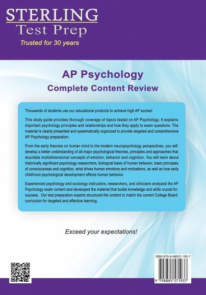 Recommended by teachers. Trusted by students. Higher score guarantee! Thousands of students use Sterling Test Prep to achieve high test scores! Comprehensive review of topics tested on AP Psychology exam. This study guide provides thorough coverage of topics tested on AP Psychology. It explains important psychology principles and relationships and how they apply to exam questions. The material is clearly presented and systematically organized to provide targeted and comprehensive AP Psychology preparation. From the early theories on human mind to the modern neuropsychology perspectives, you will develop a better understanding of all major psychological theories, principles and approaches that elucidate multidimensional concepts of emotion, behavior and cognition. You will learn about historically significant psychology researchers, biological basis of human behavior, basic principles of consciousness and cognition, what drives human emotions and motivations, as well as how early childhood psychological development affects human behavior. Experienced psychology and sociology instructors, researchers, and clinicians analyzed the AP Psychology exam content and developed the material that builds knowledge and skills crucial for success. Our test preparation experts structured the content to match the current College Board curriculum for targeted and effective learning.