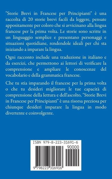 "Storie Brevi in Francese per Principianti" è una raccolta di 20 storie brevi facili da leggere, pensate appositamente per coloro che si avvicinano alla lingua francese per la prima volta. Le storie sono scritte in un linguaggio semplice e presentano personaggi e situazioni quotidiane, rendendole ideali per chi sta iniziando a imparare la lingua. Ogni racconto include una traduzione in italiano e da esercizi, che permettono ai lettori di verificare la comprensione e ampliare le conoscenze del vocabolario e della grammatica francese. Che tu stia imparando il francese per la prima volta o che tu desideri migliorare le tue capacità di comprensione della lettura e dell'ascolto, "Storie Brevi in Francese per Principianti" è una risorsa preziosa per chiunque desideri imparare la lingua in modo divertente e coinvolgente.