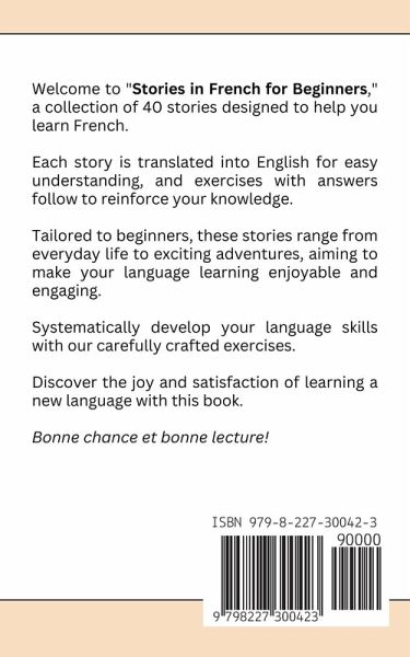 Welcome to the book "Stories in French for Beginners". This unique collection contains 40 carefully selected stories to help you learn French. Each story is translated into English, making it easier to understand and follow the plot. Additionally, after each story, you'll find exercises with answers to help reinforce the knowledge you've gained. The stories in this book vary in themes and levels of difficulty, but all are tailored to the beginner level. You'll find everyday stories as well as more exciting adventures. Each story aims to develop your knowledge of French in an enjoyable and engaging way. The exercises accompanying each story are designed to test your understanding of the text and help you learn new words and grammatical structures. Thanks to these exercises, you will be able to systematically develop your language skills. I hope this book becomes for you not only a learning tool but also a source of joy and satisfaction in discovering a new language.