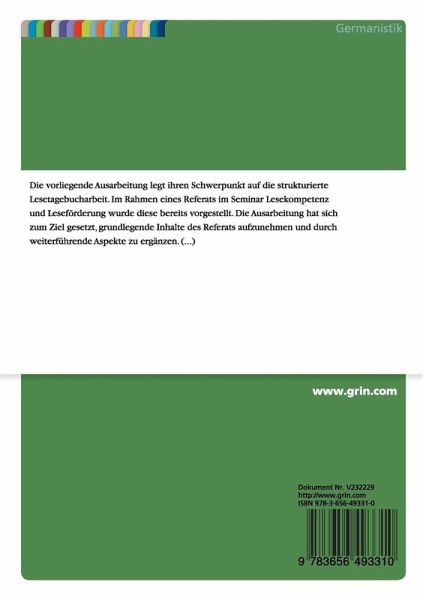 Studienarbeit aus dem Jahr 2013 im Fachbereich Deutsch - Pädagogik, Didaktik, Sprachwissenschaft, Universität Hildesheim (Stiftung), Sprache: Deutsch, Abstract: Die vorliegende Ausarbeitung legt ihren Schwerpunkt auf die strukturierteLesetagebucharbeit. Im Rahmen eines Referats im Seminar Lesekompetenz undLeseförderung wurde diese bereitsvorgestellt. Die Ausarbeitung hat sich zum Ziel gesetzt, grundlegende Inhalte desReferats aufzunehmen und durch weiterführende Aspekte zu ergänzen.Zunächst wird verdeutlicht, warum das Lesetagebuch ein handlungs- undproduktionsorientiertes Verfahren darstellt, welche pädagogischen Intentionenbeabsichtigt werden und wie ein Lesetagebuch aufgebaut ist1.Da die vorliegende Ausarbeitung ausschließlich das strukturierte Lesetagebuchbehandelt, werden anschließend die Formen des strukturierten Lesetagebuchsbeleuchtet. Nachdem die Auseinandersetzungsweisen in einem Lesetagebucherläutert und durch Beispiele veranschaulicht wurden, erfolgen Hinweise zumUnterricht mit dem strukturierten Lesetagebuch.Damit eine Beurteilung der strukturierten Lesetagebucharbeit stattfinden kann,werden schlussendlich ihre Vor- und Nachteile diskutiert.
