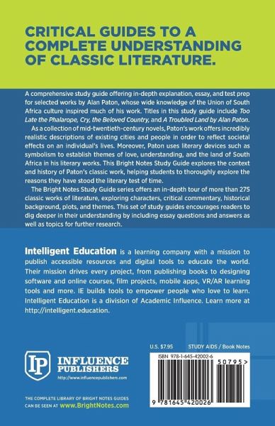 A comprehensive study guide offering in-depth explanation, essay, and test prep for selected works by Alan Paton, whose wide knowledge of the Union of South Africa culture inspired much of his work. Titles in this study guide include Too Late the Phalarope, Cry, the Beloved Country, and A Troubled Land by Alan Paton. As a collection of mid-twentieth-century novels, Paton's work offers incredibly realistic descriptions of existing cities and people in order to reflect societal effects on an individual's lives. Moreover, Paton uses literary devices such as symbolism to establish themes of love, understanding, and the land of South Africa in his literary works. This Bright Notes Study Guide explores the context and history of Paton's classic work, helping students to thoroughly explore the reasons they have stood the literary test of time. Each Bright Notes Study Guide contains: - Introductions to the Author and the Work - Character Summaries - Plot Guides - Section and Chapter Overviews - Test Essay and Study Q&As The Bright Notes Study Guide series offers an in-depth tour of more than 275 classic works of literature, exploring characters, critical commentary, historical background, plots, and themes. This set of study guides encourages readers to dig deeper in their understanding by including essay questions and answers as well as topics for further research.