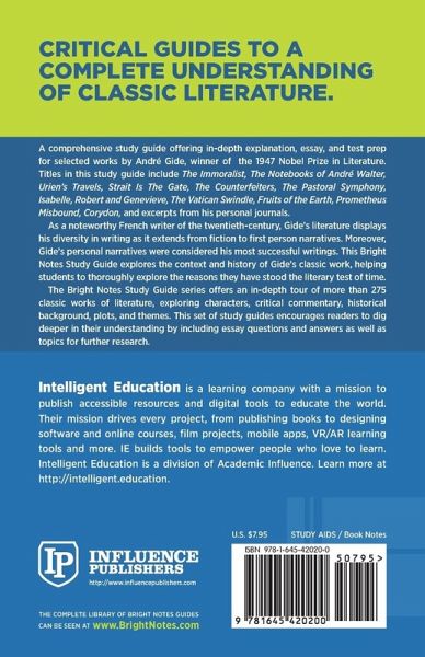 A comprehensive study guide offering in-depth explanation, essay, and test prep for selected works by Andre Gide, winner of the 1947 Nobel Prize in Literature. Titles in this study guide include The Immoralist, The Notebooks of Andre Walter, Urien's Travels, Strait Is The Gate, The Counterfeiters, The Pastoral Symphony, Isabelle, Robert and Genevieve, The Vatican Swindle, Fruits of the Earth, Prometheus Misbound, Corydon, and excerpts from his personal journals. As a noteworthy French writer of the twentieth-century, Gide's literature displays his diversity in writing as it extends from fiction to first person narratives. Moreover, Gide's personal narratives were considered his most successful writings. This Bright Notes Study Guide explores the context and history of Gide's classic work, helping students to thoroughly explore the reasons they have stood the literary test of time. Each Bright Notes Study Guide contains: - Introductions to the Author and the Work - Character Summaries - Plot Guides - Section and Chapter Overviews - Test Essay and Study Q&As The Bright Notes Study Guide series offers an in-depth tour of more than 275 classic works of literature, exploring characters, critical commentary, historical background, plots, and themes. This set of study guides encourages readers to dig deeper in their understanding by including essay questions and answers as well as topics for further research.