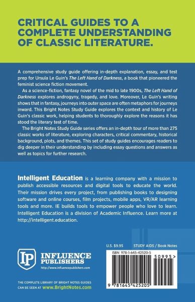 A comprehensive study guide offering in-depth explanation, essay, and test prep for Ursula Le Guin's The Left Hand of Darkness, a book that pioneered the feminist science fiction movement. As a science-fiction, fantasy novel of the mid to late 1900s, The Left Hand of Darkness explores androgyny, tragedy, and love. Moreover, Le Guin's writing shows that in fantasy, journeys into outer space are often metaphors for journeys inward. This Bright Notes Study Guide explores the context and history of Le Guin's classic work, helping students to thoroughly explore the reasons it has stood the literary test of time. Each Bright Notes Study Guide contains: - Introductions to the Author and the Work - Character Summaries - Plot Guides - Section and Chapter Overviews - Test Essay and Study Q&As The Bright Notes Study Guide series offers an in-depth tour of more than 275 classic works of literature, exploring characters, critical commentary, historical background, plots, and themes. This set of study guides encourages readers to dig deeper in their understanding by including essay questions and answers as well as topics for further research.