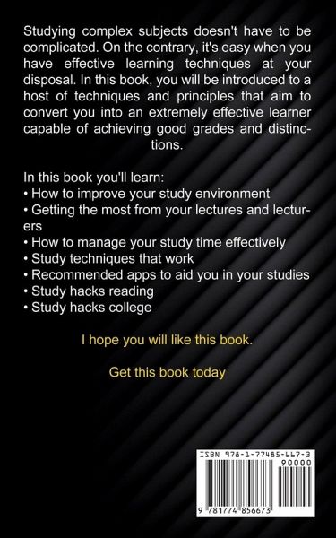 Studying complex subjects doesn't have to be complicated. On the contrary, it's easy when you have effective learning techniques at your disposal. In this book, you will be introduced to a host of techniques and principles that aim to convert you into an extremely effective learner capable of achieving good grades and distinctions. In this book you'll learn:How to improve your study environment Getting the most from your lectures and lecturers How to manage your study time effectively Study techniques that work Recommended apps to aid you in your studies Study hacks reading Study hacks college I hope you will like this book. Get this book today