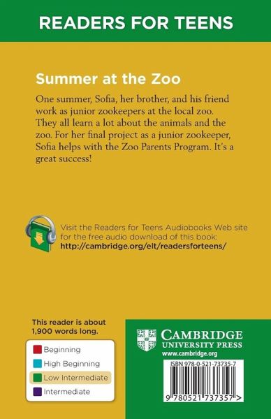 Readers for Teens provide engaging fictional stories with important themes for young learners of American English. One summer, Sofia, her brother, and two friends work as Junior Zookeepers at the local zoo. They all learn a lot about the animals and the zoo. For her final project as a Junior Zookeeper, Sofia helps with the Zoo Parents Program. It's a great success! This reader is about 1900 words long.