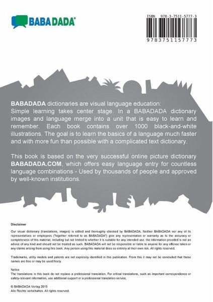 BABADADA dictionaries are visual language education: Simple learning takes center stage. In a BABADADA dictionary images and language merge into a unit that is easy to learn and remember. Each book contains over 1000 black-and-white illustrations. The goal is to learn the basics of a language much faster and with more fun than possible with a complicated text dictionary. This book is based on the very successful online picture dictionary BABADADA.COM, which offers easy language entry for countless language combinations - Used by thousands of people and approved by well-known institutions. The languages used in this book are also called as follows: finnisch, finlandais, finlandés, finlandese, finlandês