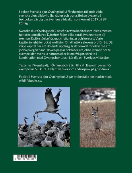I boken Svenska djur Övningsbok 2 får du möta följande vilda svenska djur: vildsvin, älg, rådjur och trana. Boken bygger på textboken Lär dig om Sveriges vilda djur som kom ut 2019 på BF Förlag. Svenska djur Övningsbok 2 består av fyra kapitel som inleds med en faktatext om djuret. Därefter följer olika språkövningar som till exempel läsförståelsefrågor, skrivövningar och korsord. Varje kapitel innehåller också ordlistor för att utöka elevens ordförråd. Då varje kapitel har ett liknande upplägg är det enkelt för eleverna att jobba på egen hand. Boken passar också för att jobba i teman om till exempel den svenska naturen eller klimatfrågor, särskilt i kombination med Övningsbok 1 och Lär dig om Sveriges vilda djur. Texterna i Svenska djur Övningsbok 2 är lätta att läsa och passar för exempelvis SFI kurs D eller Svenska som andraspråk på grundnivå. Facit till Svenska djur Övningsbok 2 går att beställa kostnadsfritt på wildlifebooks.se.