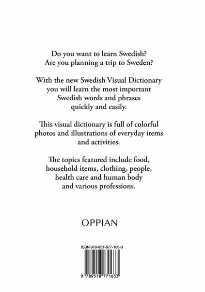 Do you want to learn Swedish? Are you planning a trip to Sweden? With the new Swedish Visual Dictionary you will learn the most important Swedish words and phrases quickly and easily. This visual dictionary is full of colorful photos and illustrations of everyday items and activities. The topics featured include food, household items, clothing, people, health care and human body and various professions.