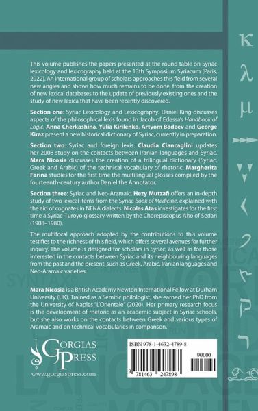 This volume publishes the papers presented at the round table on Syriac lexicology and lexicography held at the 13th Symposium Syriacum (Paris, 2022). An international group of scholars approaches this field from several new angles and shows how much remains to be done, from the creation of new lexical databases to the update of previously existing ones and the study of new lexica that have been recently discovered. Section one: Syriac Lexicology and Lexicography. Daniel King discusses aspects of the philosophical lexis found in Jacob of Edessa's Handbook of Logic. Anna Cherkashina, Yulia Kirilenko, Artyom Badeev and George Kiraz present a new historical dictionary of Syriac, currently in preparation. Section two: Syriac and foreign lexis. Claudia Ciancaglini updates her 2008 study on the contacts between Iranian languages and Syriac. Mara Nicosia discusses the creation of a trilingual dictionary (Syriac, Greek and Arabic) of the technical vocabulary of rhetoric. Margherita Farina studies for the first time the multilingual glosses compiled by the fourteenth-century author Daniel the Annotator. Section three: Syriac and Neo-Aramaic. Hezy Mutzafi offers an in-depth study of two lexical items from the Syriac Book of Medicine, explained with the aid of cognates in NENA dialects. Nicolas Atas investigates for the first time a Syriac-¿uroyo glossary written by the Chorepiscopus A¿o of Sedari (1908-1980). The multifocal approach adopted by the contributions to this volume testifies to the richness of this field, which offers several avenues for further inquiry. The volume is designed for scholars in Syriac, as well as for those interested in the contacts between Syriac and its neighbouring languages from the past and the present, such as Greek, Arabic, Iranian languages and Neo-Aramaic varieties.