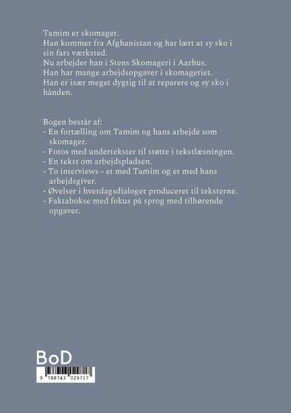Tamim er skomager. Han kommer fra Afghanistan og har lært at sy sko i sin fars værksted. Nu arbejder han i Stens Skomageri i Aarhus. Han har mange arbejdsopgaver i skomageriet. Han er især meget dygtig til at reparere og sy sko i hånden. Bogen består af: En fortælling om Tamim og hans arbejde som skomager. Fotos med undertekster til støtte i tekstlæsningen. En tekst om arbejdspladsen. To interviews, et med Tamim og et med hans arbejdsgiver. Øvelser i hverdagsdialoger produceret til teksterne. Faktabokse med fokus på sprog med tilhørende opgaver.