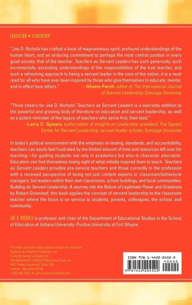In today's political environment with the emphasis on testing, standards, and accountability, teachers can easily feel frustrated by the amount of time and resources left over for teaching-for guiding students not only in academics but also in character education. Educators can find themselves losing focus of what initially inspired them to teach. Teachers as Servant Leaders provides pre-service teachers and those currently in the profession with a renewed perspective of not just being a content expert or classroom/behavioral manager, but leaders within their own classrooms, school buildings, and local communities.