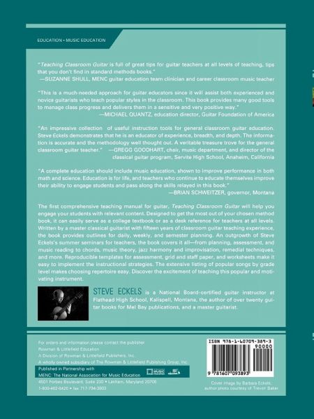 This is a much-needed approach for guitar educators since it will assist both experienced and novice guitarists teaching popular styles in the classroom. For any musical style, there are many good tools to manage class progress in this book, delivered in a sensitive and very positive way. -- Michael Quantz, education director, Guitar Foundation of America Teaching Classroom Guitar is full of great tips for guitar teachers at all levels of teaching, tips that you don't find in standard methods books. -- Suzanne Shull, MENC guitar education team clinician and career classroom music teacher A complete education should include music education, shown to improve performance in both math and science. Education is for life, teachers who continue to educate themselves improve their ability to engage students and pass along the skills relayed in this book. -- Brian Schweitzer, governor, Montana An impressive collection of a wide array of tools useful for general classroom guitar education. Steve Eckels demonstrates that he is an educator of experience, breadth, and depth. The information is accurate and methodology well thought out. A veritable treasure trove for the general classroom guitar teacher. -- Gregg Goodhart, chair, Music Department, and director of the classical guitar program, Servite High School, Anaheim, California I've been teaching a one semester generic guitar course at the University of Maine and the University of Southern Maine for 25 years. The course has morphed into guitar course for music education majors. Your book has been instrumental in furthering this gradual transformation. It is a formidable text! Every idea I've ever had or stolen about teaching this course is in your book plus many more. As a classical guitarist I appreciate the inclusion of good posture and sensible use of the hands etc. Congratulations on such a thorough and no nonsense book. There is absolutely no fat in it! -- Keith Crook, classical guitar instructor at The School of Music at the University of Southern Maine
