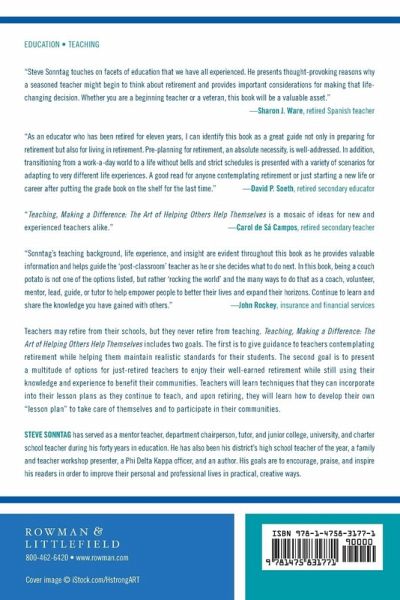 Teachers may retire from their schools, but they never retire from teaching. Teaching, Making a Difference includes two goals. The first is to give guidance to teachers contemplating retirement while helping them to maintain realistic standards for their students. The second goal is to present a multitude of options for just-retired teachers to enjoy their well-earned retirement while still using their knowledge and experience to benefit their communities.