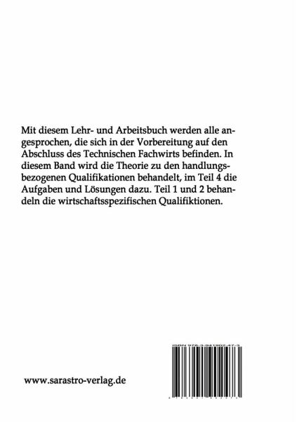 Aus der bewährten Reihe "Das prüfungsrelevante Wissen" richtet sich dieses Lehr- und Arbeitsbuch an alle, die sich optimal und zielgerichtet auf die Abschlussprüfung zum Technischen Fachwirt vorbereiten möchten. Behandelt wird in diesem Teil 3 die Theorie zu den handlungsbezogenen Qualifikationen.