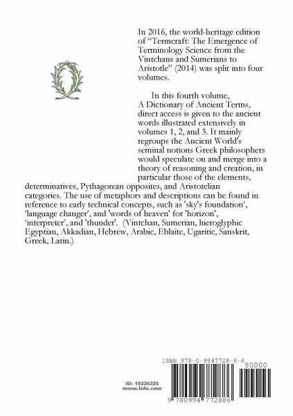 This Dictionary gives direct access to the ancient words illustrated extensively in Termcraft's volumes 1, 2, and 3. It mainly regroups the Ancient World's seminal notions Greek philosophers would speculate on and merge into a theory of reasoning and creation, in particular those of the elements, determinatives, Pythagorean opposites, and Aristotelian categories. The use of metaphors and descriptions can be found in reference to early technical concepts, such as 'sky's foundation', 'language changer', and 'words of heaven' for 'horizon,' 'interpreter', and 'thunder'. (Vintchan, Sumerian, hieroglyphic Egyptian, Akkadian, Hebrew, Arabic, Eblaite, Ugaritic, Sanskrit, Greek, Latin.)