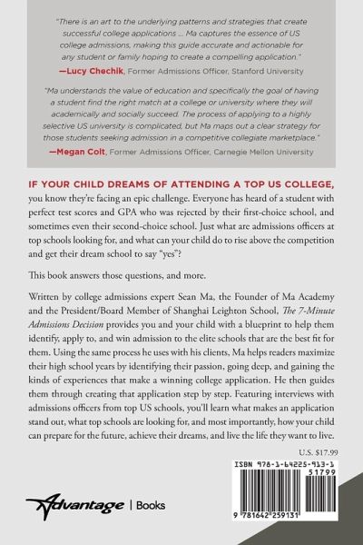 The average college admissions officer makes their decision in 7 minutes. This book will help you and your child make every minute count. If your child dreams of attending a top U.S. college, you know they're facing an epic challenge. Everyone has heard of a student with perfect test scores and GPA who was rejected by their first-choice school, and sometimes even their second-choice school. Just what are admissions officers at top schools looking for, and what can your child do to rise above the competition and get their dream school to say "yes?" This book answers those questions, and more. Written by college admissions expert Sean Ma, Founder/CEO of Ma Academy and President/Board Member of Shanghai Leighton School, The 7-Minute Admissions Decision provides you and your child with a blueprint to help them identify, apply to and win admission to the elite schools that are the best fit for them. Using the same process he uses with his clients, Ma helps readers maximize their high school years by identifying their passion, going deep, and gaining the kinds of experiences that make a winning college application. He then guides them through creating that application step by step. Featuring interviews with admissions officers from top U.S. schools, you'll learn what makes an application stand out, what top schools are looking for, and most importantly, how your child can prepare for the future, achieve their dreams, and live the lives they want to live.