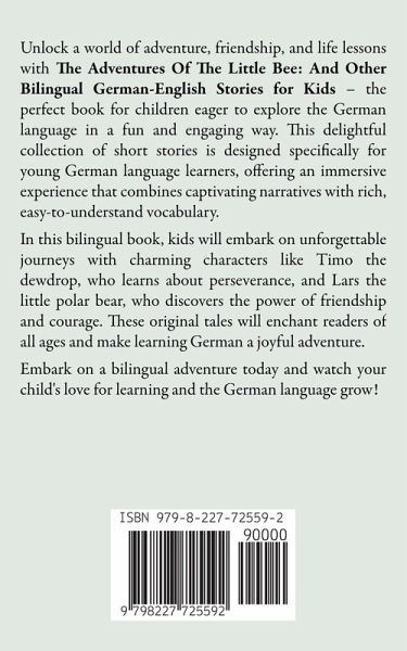 Unlock a world of adventure, friendship, and life lessons with The Adventures Of The Little Bee: And Other Bilingual German-English Stories for Kids - the perfect book for children eager to explore the German language in a fun and engaging way. This delightful collection of short stories is designed specifically for young German language learners, offering an immersive experience that combines captivating narratives with rich, easy-to-understand vocabulary. In this bilingual book, kids will embark on unforgettable journeys with charming characters like Timo the dewdrop, who learns about perseverance, and Lars the little polar bear, who discovers the power of friendship and courage. These original tales will enchant readers of all ages and make learning German a joyful adventure. Embark on a bilingual adventure today and watch your child's love for learning and the German language grow!