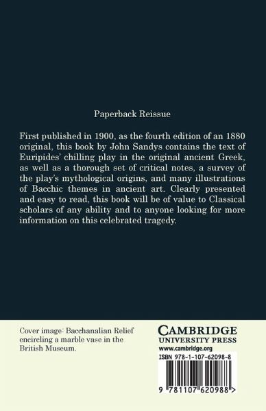 First published in 1900, as the fourth edition of an 1880 original, this book by John Sandys contains the text of Euripides' chilling play in the original ancient Greek, as well as a thorough set of critical notes, a survey of the play's mythological origins, and many illustrations of Bacchic themes in ancient art. Clearly presented and easy to read, this book will be of value to Classical scholars of any ability and to anyone looking for more information on this celebrated tragedy.
