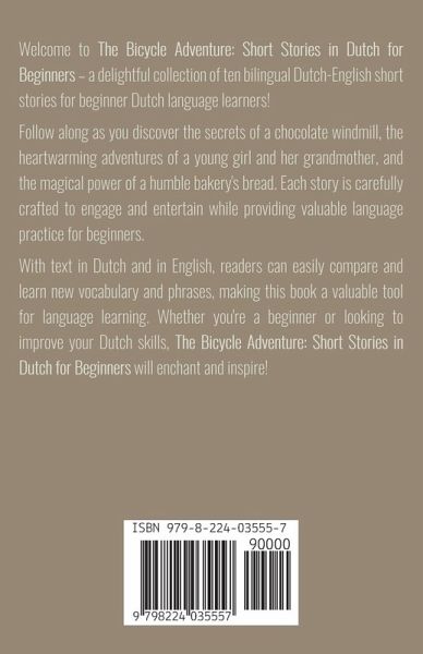 Welcome to The Bicycle Adventure: Short Stories in Dutch for Beginners - a delightful collection of ten bilingual Dutch-English short stories for beginner Dutch language learners! Follow along as you discover the secrets of a chocolate windmill, the heartwarming adventures of a young girl and her grandmother, and the magical power of a humble bakery's bread. Each story is carefully crafted to engage and entertain while providing valuable language practice for beginners. With text in Dutch and in English, readers can easily compare and learn new vocabulary and phrases, making this book a valuable tool for language learning. Whether you're a beginner or looking to improve your Dutch skills, The Bicycle Adventure: Short Stories in Dutch for Beginners will enchant and inspire!