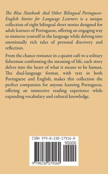 The Blue Notebook And Other Bilingual Portuguese-English Stories for Language Learners is a unique collection of nine bilingual short stories designed for adult learners of Portuguese, offering an engaging way to immerse yourself in the language while delving into emotionally rich tales of personal discovery and reflection. From the chance romance in a quaint café to a solitary fisherman confronting the meaning of life, each story delves into the heart of what it means to be human. The dual-language format, with text in both Portuguese and English, makes this collection the perfect companion for anyone learning Portuguese, offering an immersive reading experience while expanding vocabulary and cultural knowledge.