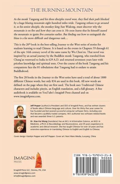 As the monk Tangseng and his three disciples travel west, they find their path blocked by a huge blazing mountain eight hundred miles wide. Tangseng refuses to go around it, so his senior disciple, the monkey king Sun Wukong, must discover why the mountain is on fire and how they can cross it. He soon learns that he himself caused the mountain to ignite five centuries earlier. But finding out how to extinguish the blaze is a far more difficult and dangerous task... This is the 20th book in the best-selling Journey to the West series of stories for students learning to read Chinese. It is based on the events in Chapters 59 through 61 of the epic 16th century novel of the same name by Wu Chen'en. That novel was inspired by an actual journey by the Buddhist monk Tangseng, who traveled from Chang'an westward to India in 629 A.D. and returned seventeen years later with priceless knowledge and spiritual texts. Over the course of the book Tangseng and his companions face the 81 tribulations that Tangseng had to endure to attain Buddhahood. The first 20 books in the Journey to the West series have used a total of about 1800 different Chinese words, but only 834 are used in this book. All new words are defined on the page where they are first used. The book uses Traditional Chinese characters and includes pinyin, an English translation, and a full glossary. A free audiobook is available on YouTube's Imagin8 Press channel and on www.imagin8press.com.