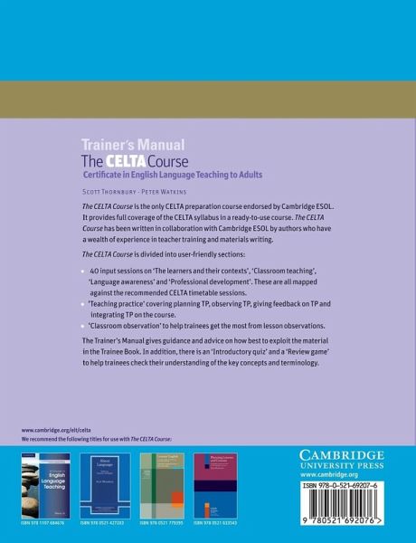 The CELTA Course is the only CELTA preparation course endorsed by Cambridge ESOL. It provides full coverage of the CELTA syllabus in a ready-to-use course. The CELTA Course is divided into user-friendly sections: * Input sessions (40 units on `The learners and their contexts', `Classroom teaching', `Language awareness', and `Professional development'). * Teaching practice. * Classroom observation. * Written assignments and tutorials. * `Resource file'. - The Trainee Book includes a range of material to be used in input sessions, helpful advice about the course, and a wealth of useful reference material. - The Trainer's Manual includes suggestions on how to best use the material with trainees as well as a bank of photocopiable material to supplement sessions. An introductory questionnaire at the start of the Trainee Book and a review test at the end check understanding of the key concepts and terminology.