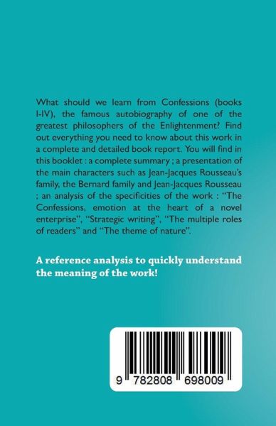 What should we learn from Confessions (books I-IV), the famous autobiography of one of the greatest philosophers of the Enlightenment? Find out everything you need to know about this work in a complete and detailed book report. You will find in this booklet : - A complete summary - A presentation of the main characters such as Jean-Jacques Rousseau's family, the Bernard family and Jean-Jacques Rousseau - An analysis of the specificities of the work: the Confessions: emotion at the heart of a novel enterprise, strategic writing, the multiple roles of readers and the theme of nature A reference analysis to quickly understand the meaning of the work.